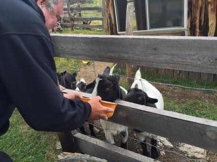 We finally did dry off, and sat outside in the sun to plan the first leg of our ride into Iowa. It looks like we will be heading in on I90 (boring!) through Minnesota for a ways. We have two long (or three shorter) riding days ahead of us, and then we will be at my sister’s house in Davenport. We made dinner and took our leftover veggies to feed the pet goats that live on this place.